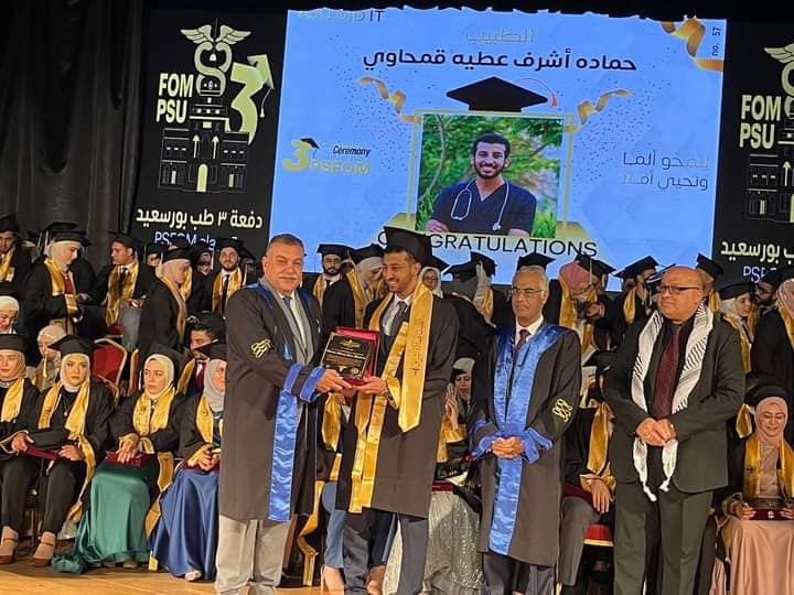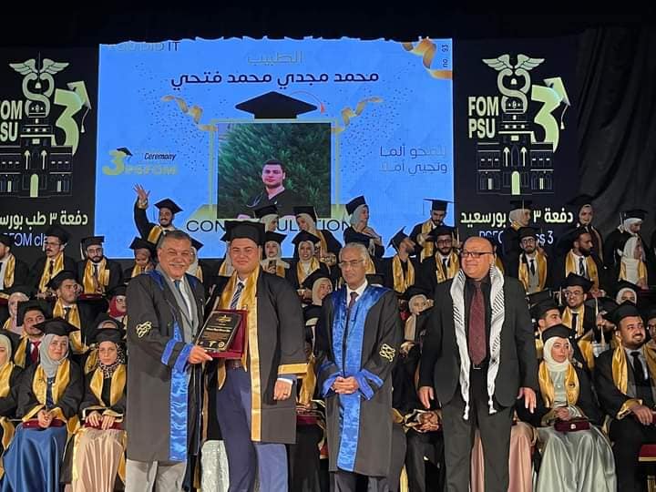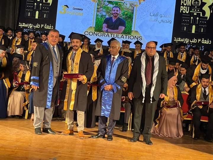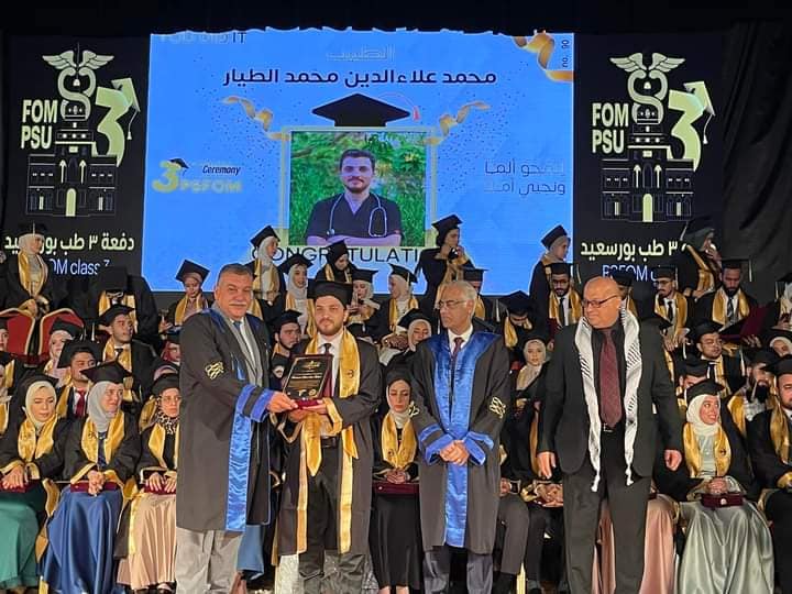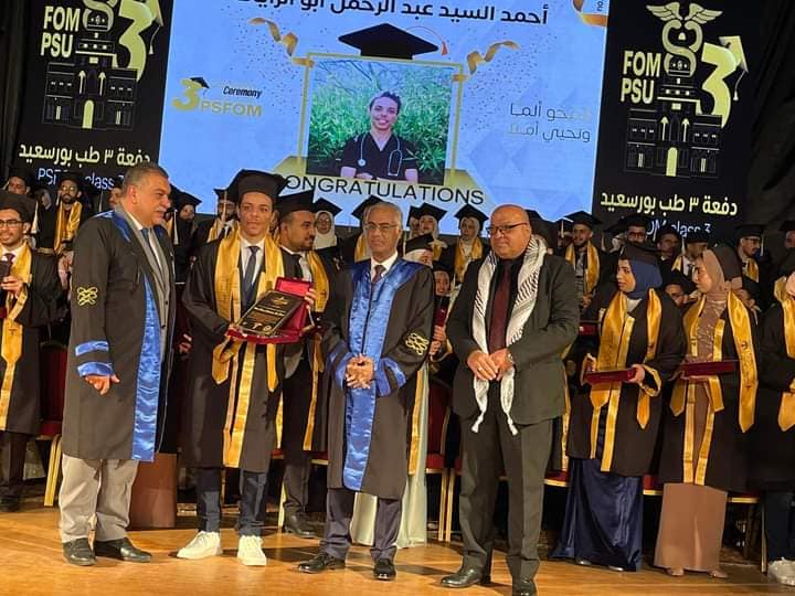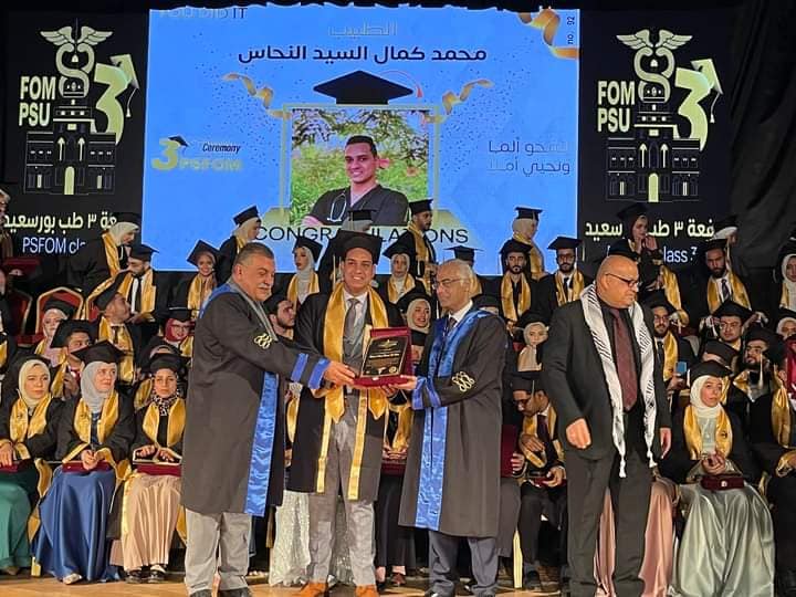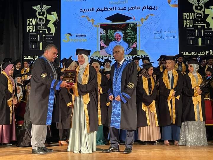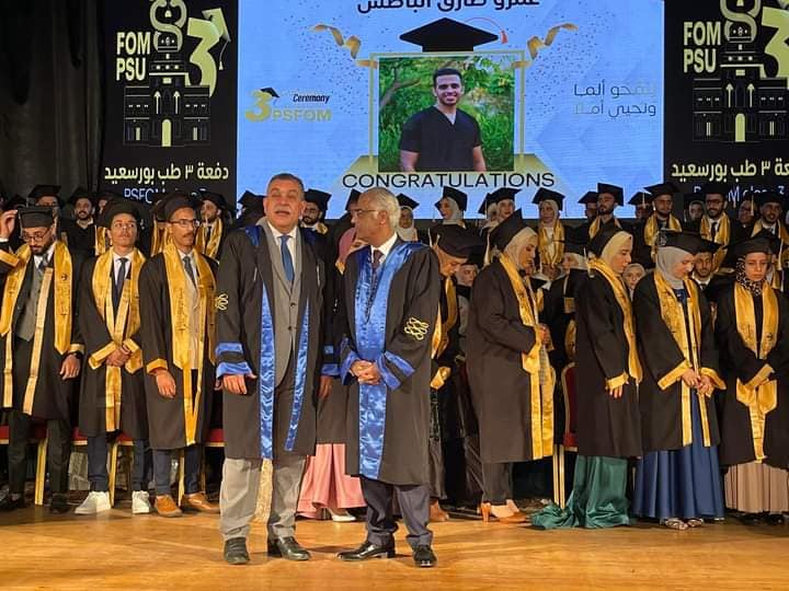 شهد السيد الأستاذ الدكتور / ايمن محمد إبراهيم رئيس جامعة بورسعيد فى حضور / الاستاذة الدكتورة / راوية رزق نائب رئيس الجامعة لشئون الدراسات العليا والبحوث والأستاذ الدكتور / عاطف علم الدين عضو مجلس الشيوخ المصري والاستاذة / سامية المصيلحى امين عام الجامعة حفل تخرج الدفعة الثالثة من كلية الطب البشرى وكان في استقبالهم الأستاذ الدكتور / خالد صبري عميد كلية الطب والسادة وكلاء كلية الطب البشرى