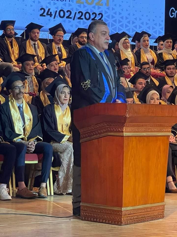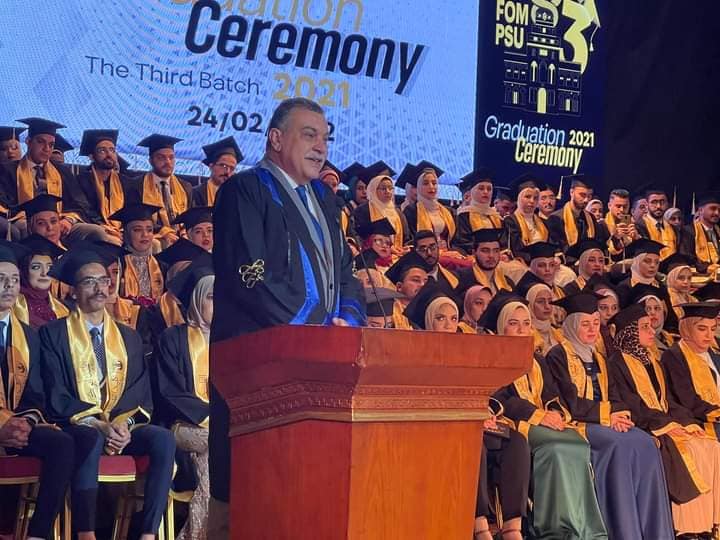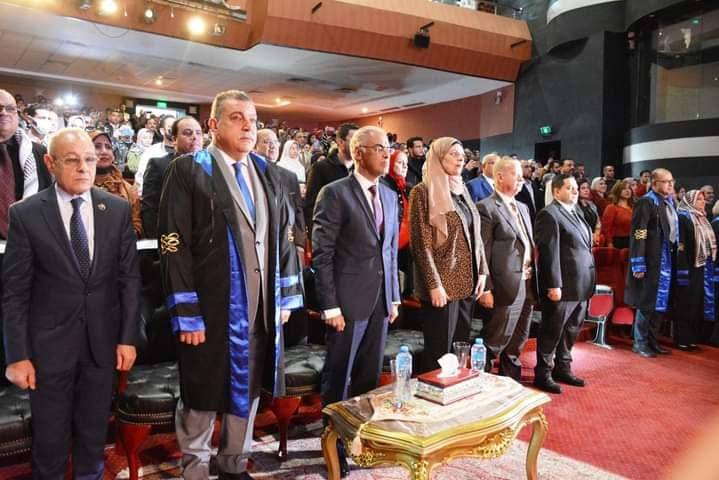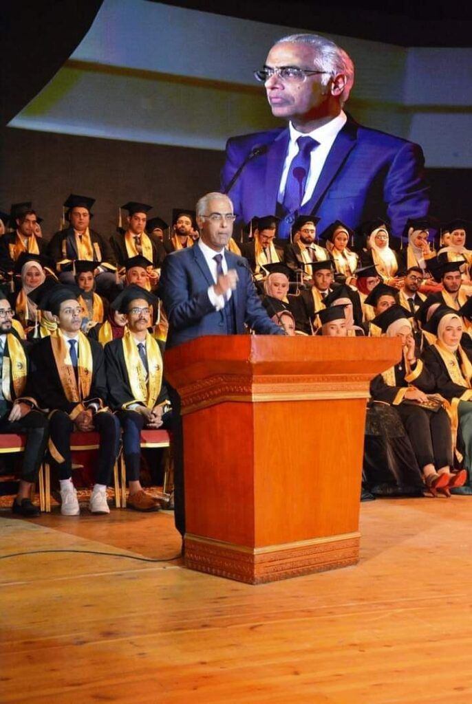 وفى كلمة السيد الأستاذ الدكتور / ايمن محمد إبراهيم رئيس الجامعة رحب فيها بضيوف حفل تخريج الدفعة الثالثة طب بورسعيد والتى تميزت بوجود 10% من خريجها من الوافدين دفعة مميزة نسبة النجاح بها 98% وبها ايضا العديد من الطلاب المبدعين والموهبين فى مختلف الانشطة الطلابية كما وجه سيادته التحية لأولياء الأمور وجهودهم مع أبنائهم للوصول إلى يوم الحصاد العظيم كما أوصى سيادته أبنائه الخريجين بمواصلة الدراسة والبحث العلمي والاجتهاد في حياتهم العملية نظرا لأهمية دور الطبيب في المجتمع ولأننا نفخر بالطبيب المصري في كل أنحاء العالم وأيضا كونهم نماذج رائعة وستظل الجامعة على تواصل معكم وإمدادكم بكل جديد متمنيا لكم كل التوفيق في حياتكم العملية