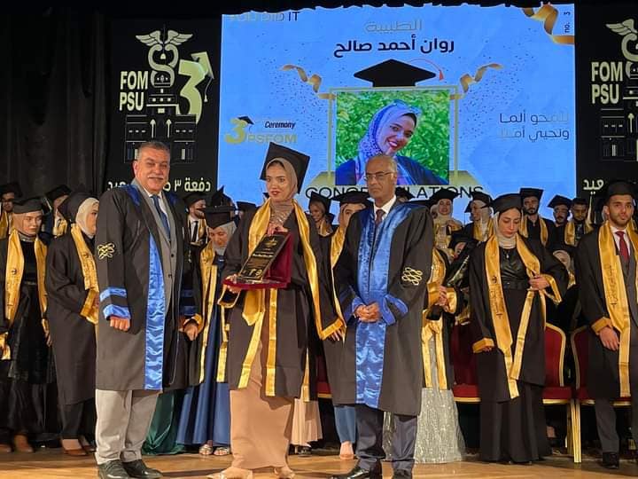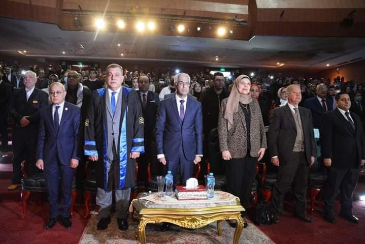 وبدأ الاحتفال بالسلام الجمهوري أعقبة آيات من الذكر الحكيم فكلمة الخريج / عبد الله حسب النبى الاول على الدفعة وكلمة الوافدين للخريج / امير اكرم من فلسطين وكلمة ناصر حماد الاول على الوافدين اعقبها اعلان النتيجة للدفعة الثالثة من الاستاذة الدكتورة / منى عبد البارى وكيل كلية الطب للتعليم والطلاب