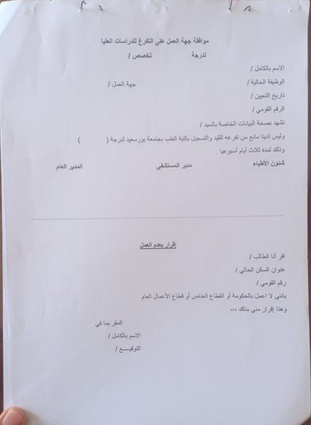 كما يمكن احضار خطاب من جهه العمل تفيد بموافقتها علي استكمال حضراتكم للدراسات العليا لدرجة الماجستير / الدكتوراة بكلية الطب جامعة بورسعيد في تخصص كذا